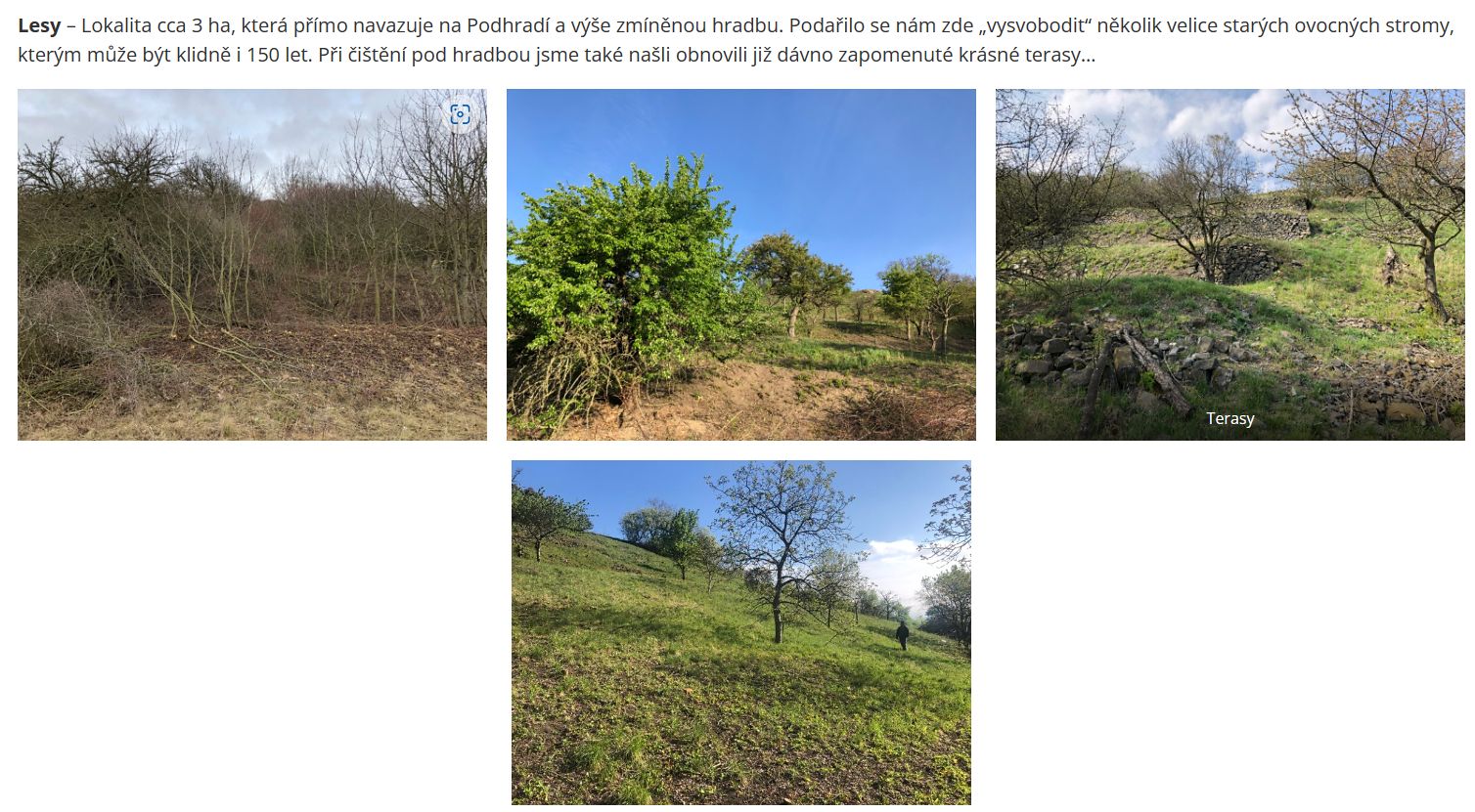 Lesy – Lokalita cca 3 ha, která přímo navazuje na Podhradí a výše zmíněnou hradbu. Podařilo se nám zde „vysvobodit“ několik velice starých ovocných stromy, kterým může být klidně i 150 let. Při čištění pod hradbou jsme také našli obnovili již dávno zapomenuté krásné terasy…